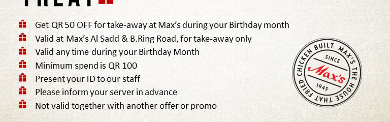It’s your Birthday! Get 50 QR OFF at Max’s Al Sadd & B.Ring Rd anytime in May! You can use this discount more than once! Just walk-in with your ID. Min spend QR 100. For more info, WhatsApp us:
