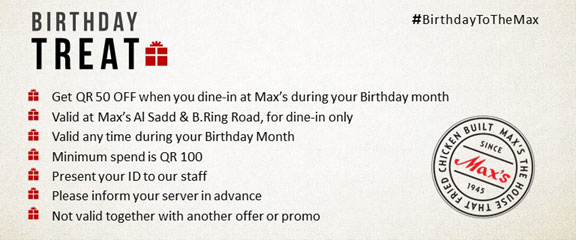 Enjoy 50 QR OFF at Max's Restaurant Al Sadd & B.Ring Road, anytime during February (your birthday month). Walk-in and present your ID to our staff. Min spend QR 100. Enjoy & Happy Birthday from all of us at Max's!