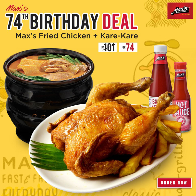 Today we celebrate 74 years of Sarap To The Bones! Thank you very much for your patronage over the years. We hope you enjoy our special promotion today. Valid for dine-in, take-out & delivery at our branches in Al Sadd & B. Ring Road. To order a delivery, click ‘Order Now’ below. Sincerely, Max’s Restaurant, Doha.