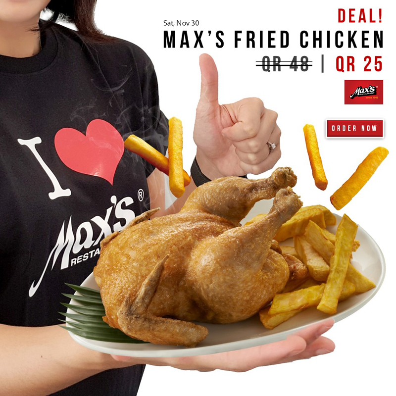 Order your favorite Max’s Whole Fried Chicken for QR 25 only today, Nov 30. Dine-in, take-out and delivery. For delivery, order online :